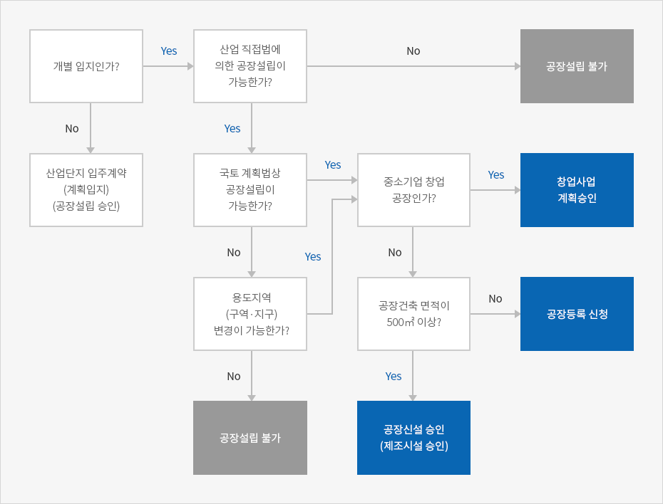 우리나라는 산업의 생산 및 활동공간을 효율적으로 확보하고 양호한 입지를 선정하기 위한 산업입지 정책을 추진하고 있으며, 체계적이고 계획적인 관리를 위해 정책적으로 대표적인 계획입지인 산업단지 에 공장을 설립하도록 권장하고 있다. 그러나 사업상의 여건, 용지가격 등 각 기업의 개별적 사유로 인해 산업단지에 공장을 설립하는 것이 부적합한 경우에는 개별 부지를 매입하고 필요한 인ㆍ허가 사항을 취득하여 공장 설립이 가능하다.