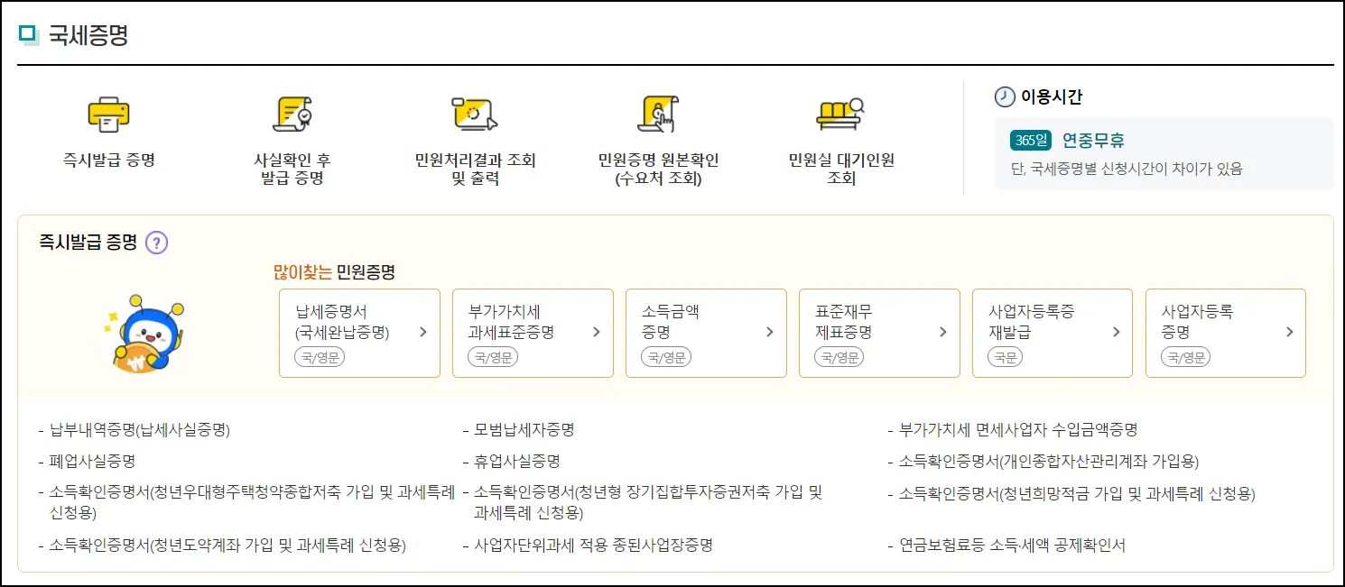 ⑭ 소득확인증명서(개인종합자산관리계좌 가입용) | 연중, 06:00~22:00 | |