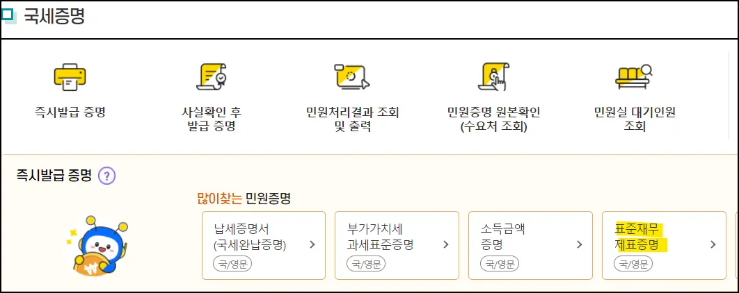 ⑨ 표준재무제표증명 | 연중, 24시간 |