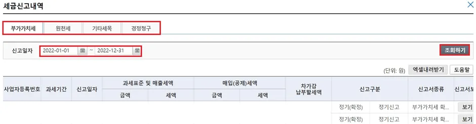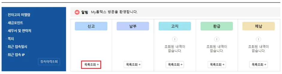 각종 세금신고내역 조회