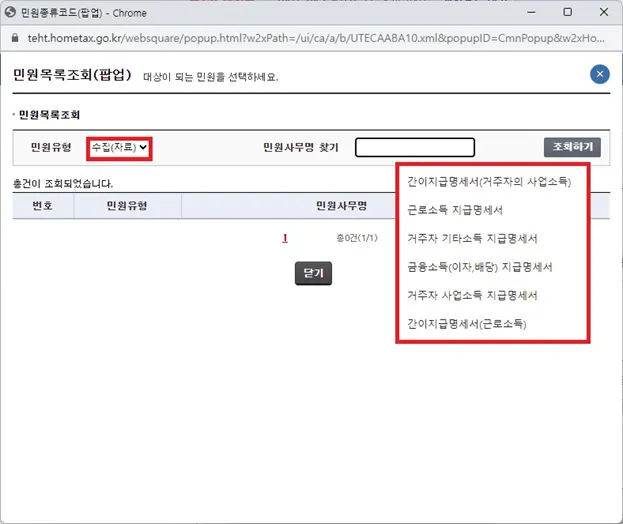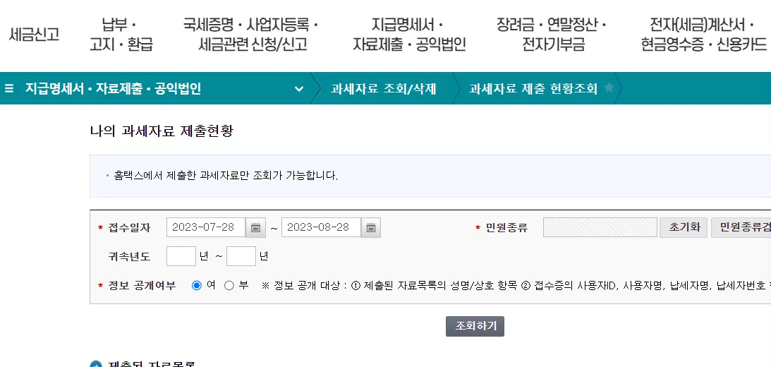 홈택스 로그인 – 사업장 선택 – 지급명세서ㆍ자료제출ㆍ공익법인 > 과세자료 조회/삭제 > 과세자료 제출 현황조회 – 조회 원하는 접수일자 입력 후 민원종류검색 – 민원목록조회(팝업)에서 민원유형 ‘수집(자료)’ 선택 - 원하는 민원사무명 조회하기 후 클릭 –팝업창 닫힌 후 조회하기 클릭