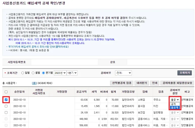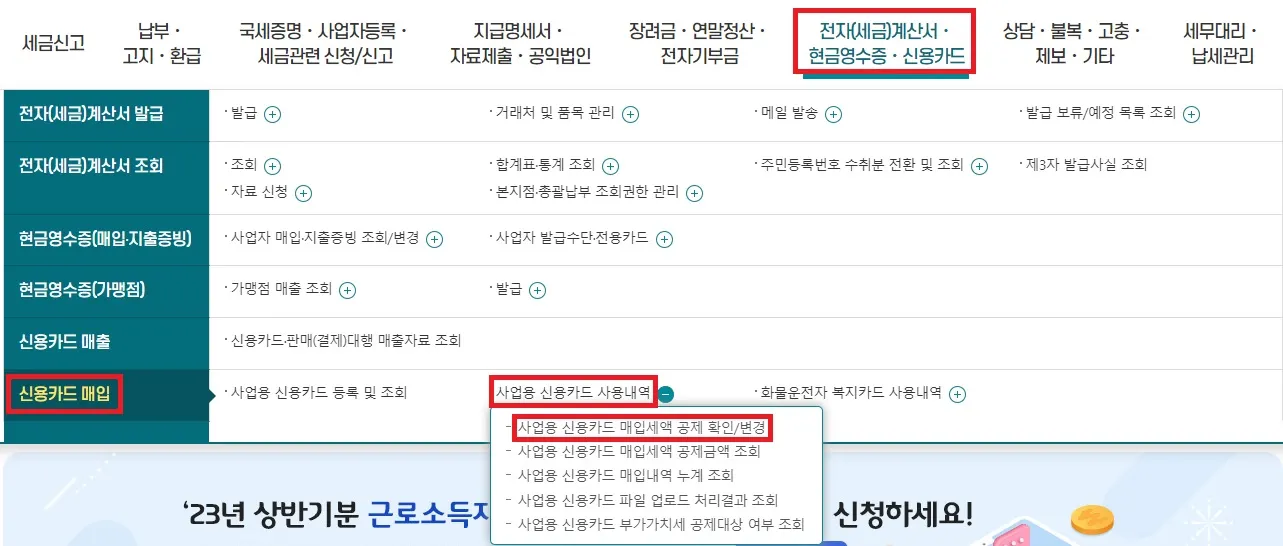 전자(세금)계산서ㆍ현금영수증ㆍ신용카드 > 신용카드 매입 > 사업용 신용카드 사용내역 > 사업용 신용카드 매입세액 공제 확인/변경 메뉴에서