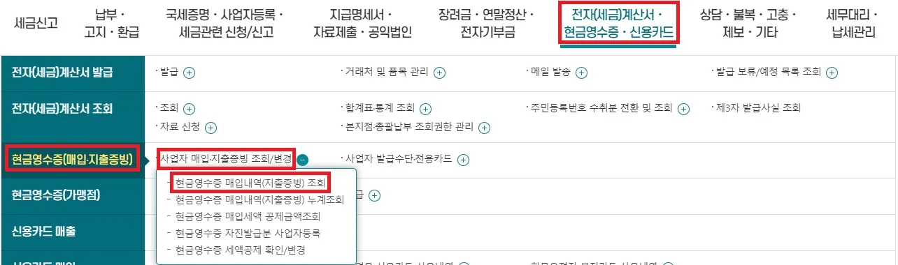 전자(세금)계산서ㆍ현금영수증ㆍ신용카드 > 현금영수증(매입·지출증빙) > 사업자 매입·지출증빙 조회/변경 > 현금영수증 매입내역(지출증빙) 조회 메뉴에서 일별/주별/월별/분기별로 구분하여 조회할 수 있습니다.