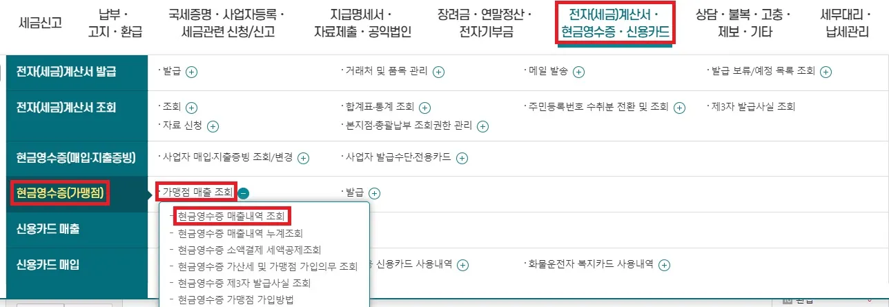 전자(세금)계산서ㆍ현금영수증ㆍ신용카드 > 현금영수증(가맹점) > 가맹점 매출 조회 > 현금영수증 매출내역 조회 메뉴에서 일별/주별/월별/분기별로 구분하여 조회할 수 있습니다.