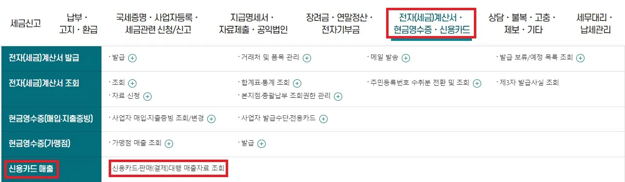 전자(세금)계산서ㆍ현금영수증ㆍ신용카드 > 신용카드 매출 > 신용카드·판매(결제)대행 매출자료 조회 메뉴에서 기간별로 조회할 수 있습니다.