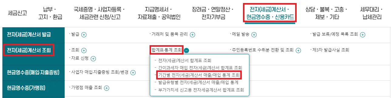 전자(세금)계산서ㆍ현금영수증ㆍ신용카드 > 전자(세금)계산서 조회 > 합계표·통계 조회 > 기간별 전자(세금)계산서 매출/매입 통계 조회 메뉴에서 월별/분기별/년도별로 구분하여 조회할 수 있습니다.