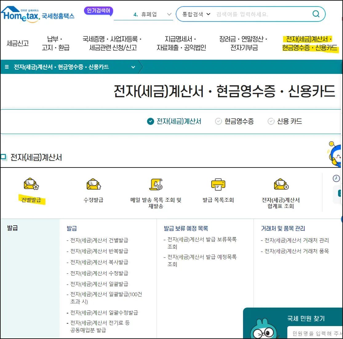 ❶ 홈택스 로그인 조회/발급 발급 건별발급 선택