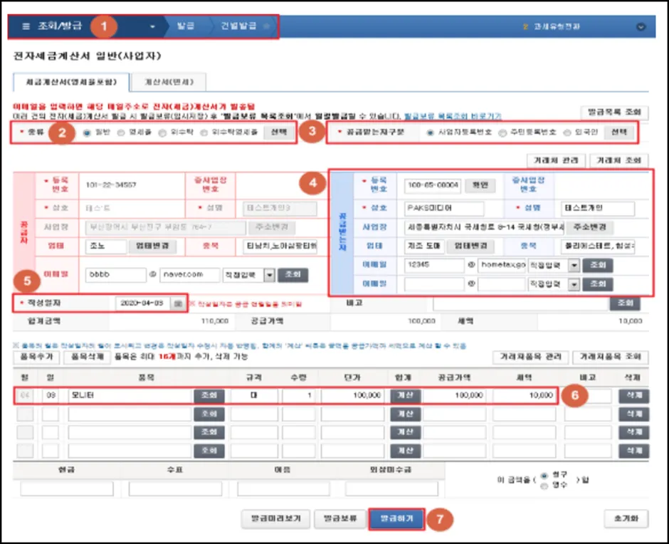 조회발급 - >발급 -> 건별 발급을선택합니다.