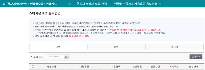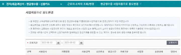 - 귀속 사업장 지정 화면 : [전자(세금)계산서ㆍ현금영수증ㆍ신용카드 > 현금영수증(근로자·소비자) > 근로자·소비자 조회/변경 > 현금영수증 지출증빙거래지정]