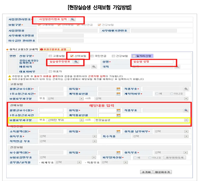 현장실습생은 근로자가 아니므로 4대보험 중 산업재해보상보험법에 따라 산재보험만 가입하여야 합니다.