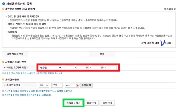 공인인증서로로그인>조회/발급>사업용신용카드>사업용신용카드등록>개인신용정보제공동의버튼클릭후 다음단계 클릭 > 사업용신용카드번호입력 >등록버튼 클릭 >등록접수완료