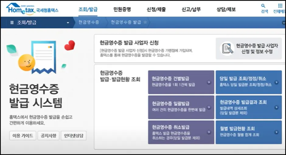 홈택스 → 조회/발급 → 현금영수증 → 현금영수증 발급 → 홈택스 발급 신청