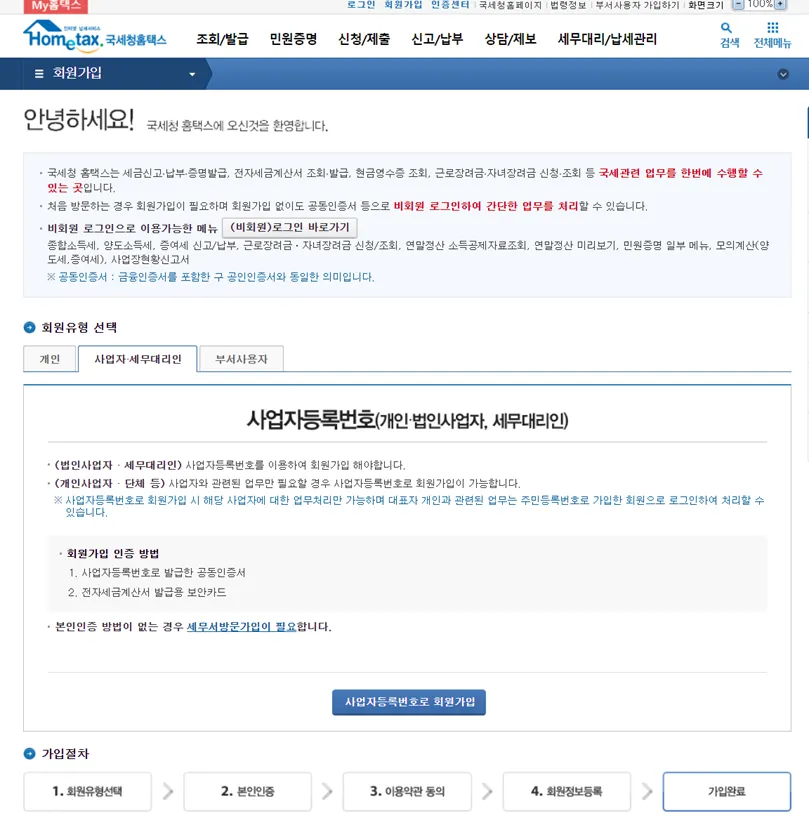 홈택스 홈페이지(www.hometax.go.kr) 또는 모바일 홈택스(손택스)를 통해 회원 가입합니다. 사업자등록번호를 이용해서 회원가입하셔야 합니다.
